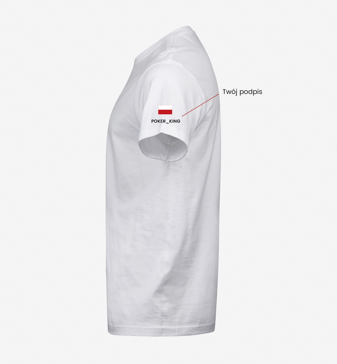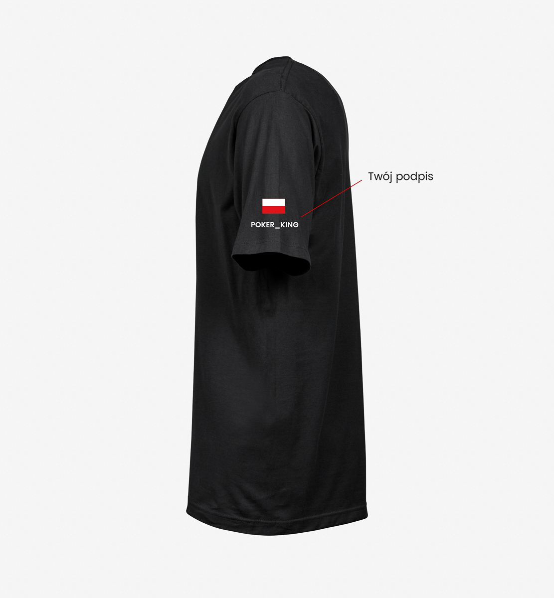 Stylowa koszulka pokerowa z czterema symbolami kart na piersi w klasycznych kolorach czarnym i czerwonym, odwzorowujących prawdziwe karty. Na plecach symbole układają się pionowo, a Ty możesz spersonalizować koszulkę własnym nickiem lub nazwiskiem, z opcją dodania flagi lub bez. Wykonana z certyfikowanej, długowłóknistej bawełny typu ringspun o gramaturze 185 g/m², z dwuwarstwowym ściągaczem przy szyi z dodatkiem elastanu oraz wzmocnieniami na ramionach, gwarantuje trwałość, a proces enzyme wash nadaje materiałowi wyjątkową miękkość i przyjemność w dotyku. Oddychająca i wytrzymała tkanina zapewnia pełen komfort nawet w wymagających sytuacjach – skutecznie odprowadza wilgoć i utrzymuje suchość. Nadruk na piersi, motyw kart na rękawie oraz możliwość personalizacji nadają koszulce nowoczesny, uniwersalny charakter, który sprawdzi się zarówno na co dzień, jak i podczas wyjątkowych okazji.