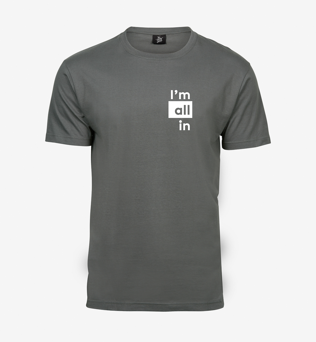 Koszulka I'm All In dla tych, którzy lubią podejmować ryzyko! Wybierz jedną z czterech wersji kolorystycznych nadruków – biały, czarny, złoty lub srebrny – i zdecyduj, czy chcesz dodać swój własny podpis na rękawie, aby podkreślić swoją indywidualność.