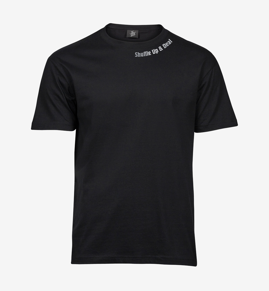 Koszulka Shuffle Up & Deal Tee wyróżnia się designerskim, zaokrąglonym napisem wokół kołnierzyka – nietypowym i efektownym detalem, który nadaje koszulce unikalny charakter. Napis jest dostępny w trzech wersjach kolorystycznych: granatowej, złotej i srebrnej, dzięki czemu możesz dopasować go do swojego stylu. Na lewym rękawku znajduje się miejsce na personalizację (dopasowana do Twojej koszulki tylko w wersji czarnej, granatowej lub białej). Na plecach umieszczono logotyp marki The Lucky River, podkreślający elegancki i nowoczesny charakter koszulki.
