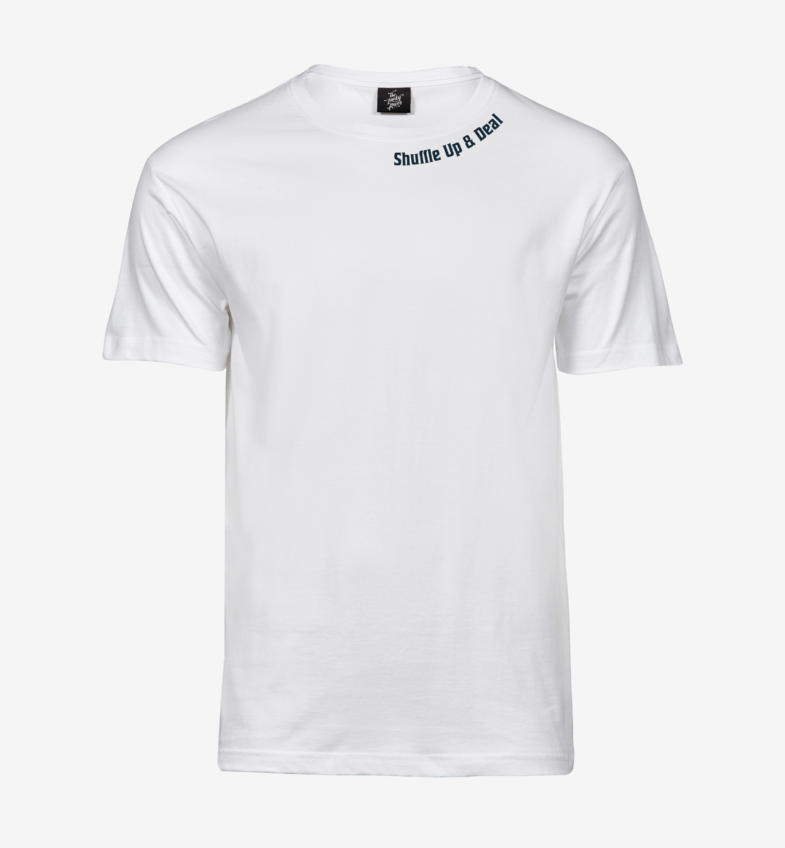 Koszulka Shuffle Up & Deal Tee wyróżnia się designerskim, zaokrąglonym napisem wokół kołnierzyka – nietypowym i efektownym detalem, który nadaje koszulce unikalny charakter. Napis jest dostępny w trzech wersjach kolorystycznych: granatowej, złotej i srebrnej, dzięki czemu możesz dopasować go do swojego stylu. Na lewym rękawku znajduje się miejsce na personalizację (dopasowana do Twojej koszulki tylko w wersji czarnej, granatowej lub białej). Na plecach umieszczono logotyp marki The Lucky River, podkreślający elegancki i nowoczesny charakter koszulki.